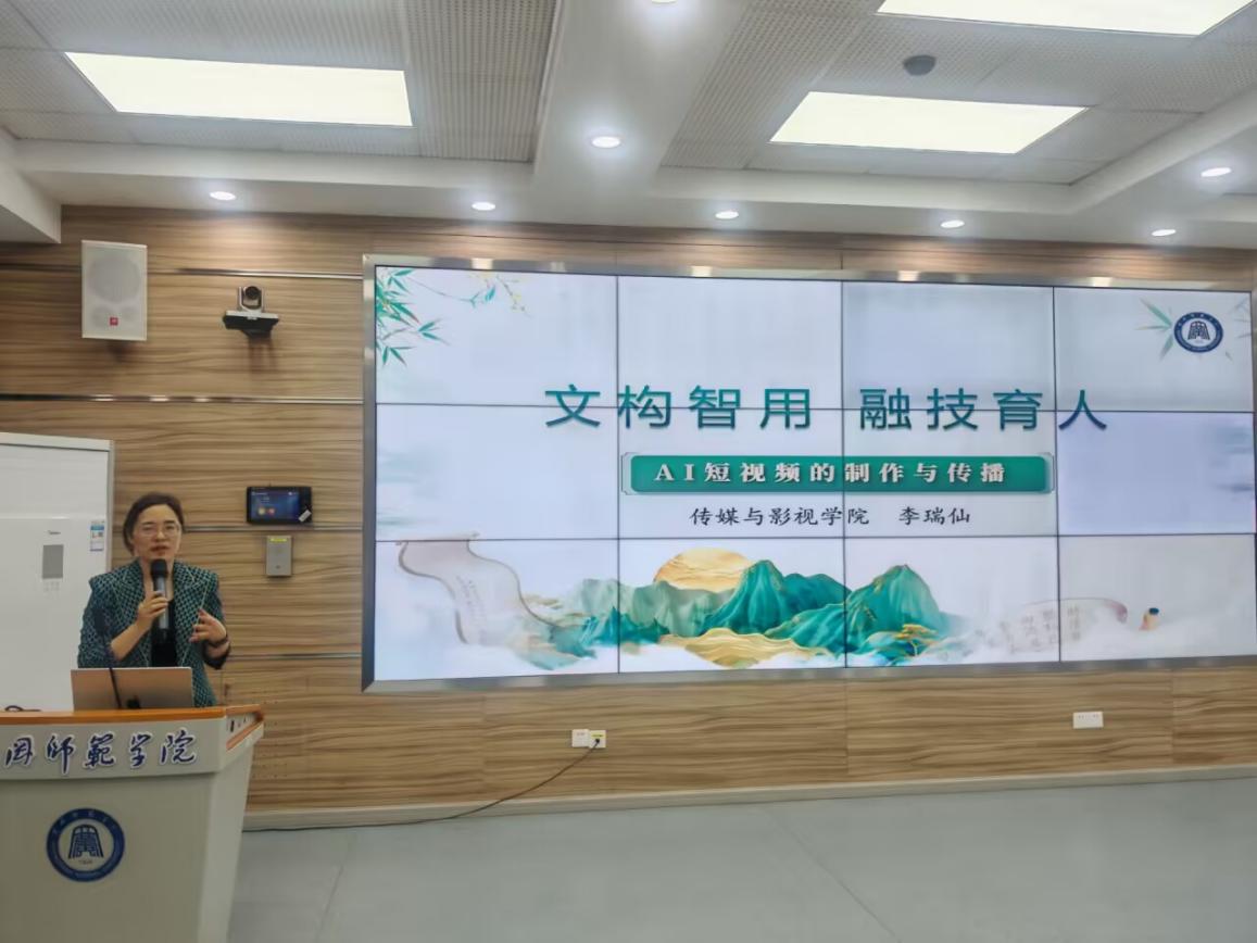 培训活动邀请传媒与影视学院李瑞仙老师主讲。李瑞仙结合教学实际,介绍了当前主流文生视频、文生音乐等AI工具的使用方法与操作技巧,引导教师将AI短视频创作灵活运用到课堂教学、课程展示与育人实践中,切实提升教学效果。